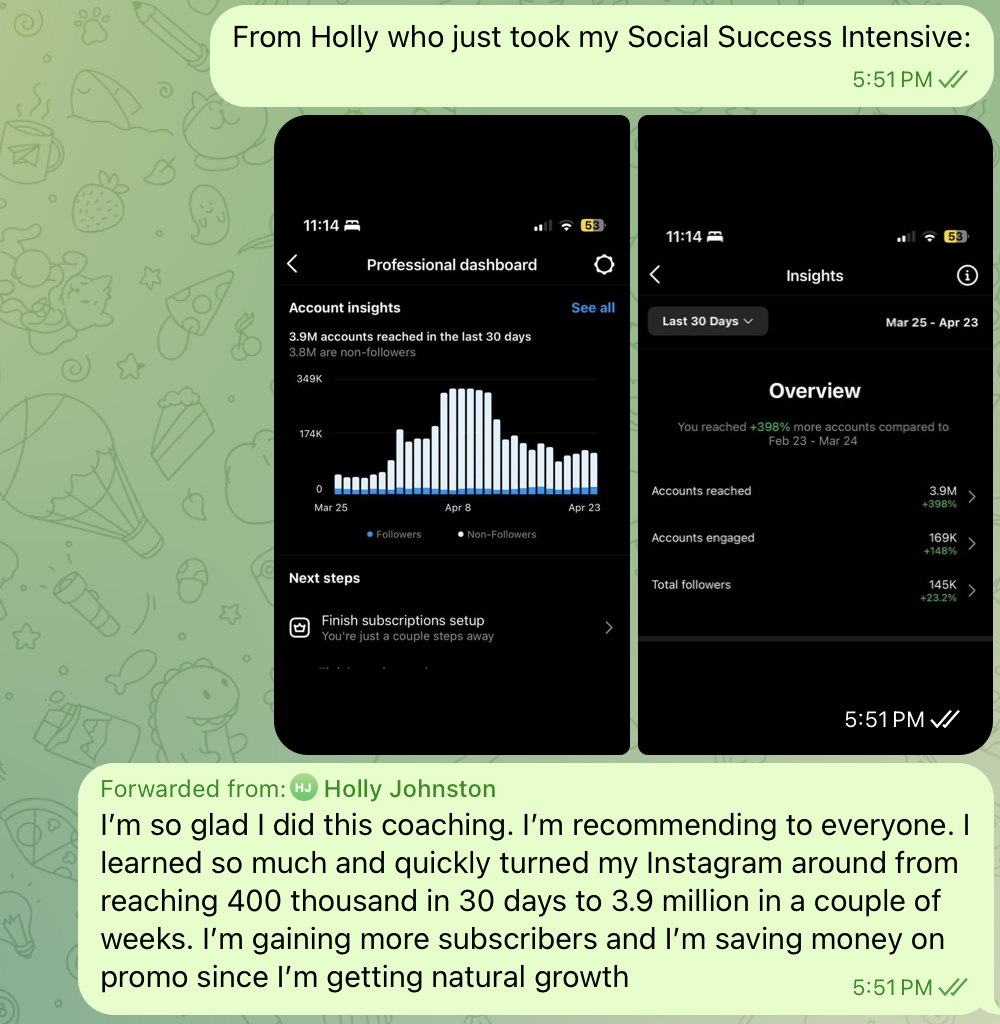 Holly Jane, a Mormon mom of four, joined my Million Follower Immersive (MFI) in April 2023 with 41k Instagram followers. She saw immediate success through my coaching, turning her account around and gaining more subscribers organically. By May 2025, Holly has nearly 3 million followers across her multiple Instagram accounts. She continues to credit the YBI Method for her success, saving money on promotions and transforming her into a social media star.